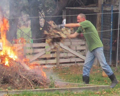 The fun for her was trying to help dad add the pile of leaves to the fire.